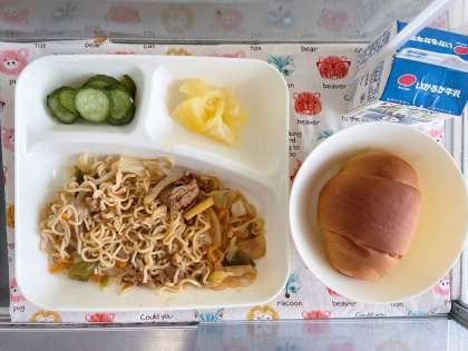 【黒糖小パン、牛乳、焼きそば、きゅうりのしょうがづけ、パインアップル(カット缶)】