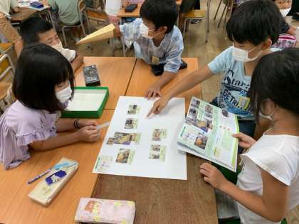 9月2日(木)1時間目、3年1組は社会科で「パン工場を見学しよう」を学習していました。コロナ禍で実際に見学に行くことができないので、先生曰く「エアー見学」ですと言っていました。パンを作る工程の写真を班で並べて、教科書で確かめていました。この後調べ活動に入り、どうしてもわからないことは電話で聞くかお手紙を書いて教えてもらうかもしれないとのことでした。