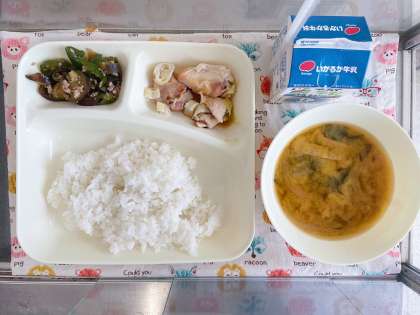 【ごはん、牛乳、焼きとり、みそ汁、なすのそぼろいため】