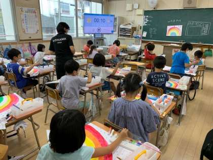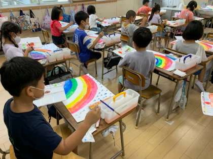 9月3日(金)3時間目、2年2組は図工で虹を描いていました。絵の具の使い方や筆の使い方の練習をしていました。