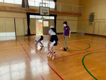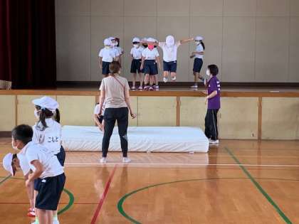 9月8日(水)3時間目、2年生は体育で忍者のように活動していました。体育館の舞台の上からふわりと跳び降りたり、2人組で馬跳びをしたりしていました。これまであまり経験がないのでしょう。馬跳びを難しそうにしている子が何人もいました。