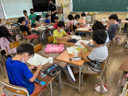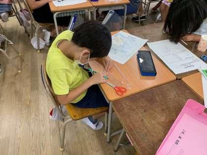 9月9日(木)5時間目、3年2組は図工で「ゴムゴムパワー」というものを作っていました。16cmのストローを4等分しているところでしたので、算数を学習しているのかなと思いました。