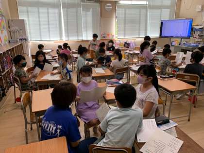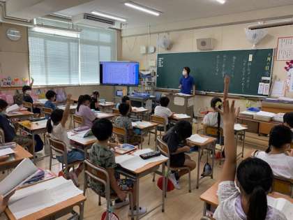 9月10日(金)1時間目、2年1組は国語で「話し合って うれしくなる ことばを あつめよう」というめあてで学習していました。話をつなぐ「こつ」について確認していました。その後グループで話を実際にしていました。