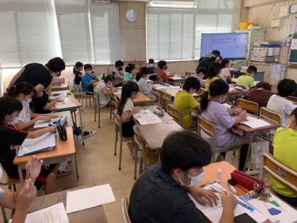 9月10日(金)1時間目、4年1組は算数で、「方眼を使って垂直な直線や平行な直線をかく方法を考えよう」というめあてで学習していました。