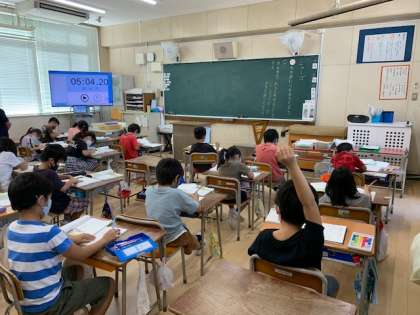 9月14日(火)1時間目、2年2組は算数で「形はかこんでいる直線の数によって、なかま分けをすることができる」ところから、三角形、四角形という言葉を習いました。