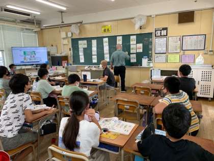 9月14日(火)5時間目、6年1組は外国語科で、「行った、見た、食べた、作った、楽しんだ」ゲームをしていました。子どもが英語で答えるたびにホワイト先生が黒板に絵を描いていきます。子どもたちは順番に答えていました。