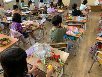 9月15日(水)1時間目、1年2組はアサガオのつるで作ったリースに飾りをつけていました。