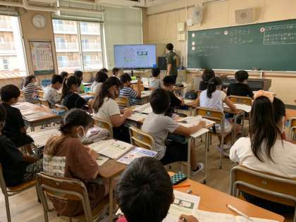 9月15日(水)2時間目、5年2組は算数で「大きさの等しい小さな分数をつくる方法を考えよう」というめあてで取り組んでいました。