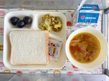 【食パン、牛乳、豆乳マカロニグラタン[米粉]、トマトスープ、ぶどう(巨峰)、りんごジャム】