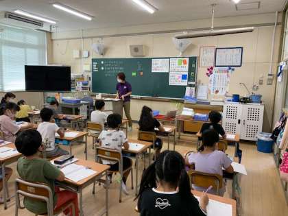 9月21日(火)1時間目、2年1組は算数で、長方形や正方形の紙を2つの頂点を通って切ってできた形について調べていました。