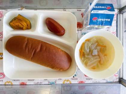 【黒糖パン、牛乳、フランクフルトのケチャップソース、スープ、焼きかぼちゃ】