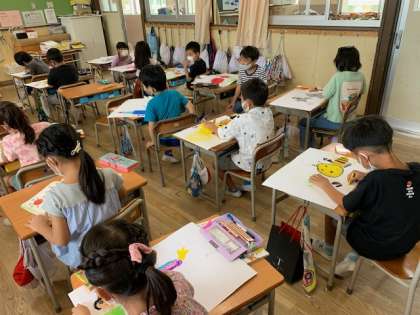 9月22日(水)1時間目、1年1組は図工で「のってみたいな いきたいな」を描いていました。自分がいろいろな動物に乗っているところをクレパスで描いていました。