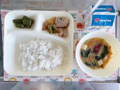 【ごはん、牛乳、豚肉の甘辛焼き、みそ汁、オクラのおかかいため】