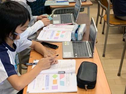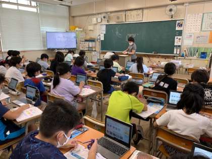 9月24日(金)1時間目、4年1組は算数でコンパスを使って四角形をかく方法を実際にしていました。パソコンにも画像を載せ、みんなで確かめをしていました。