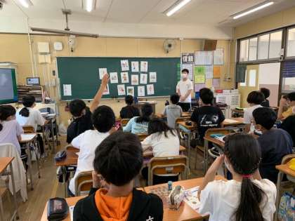 9月29日(水)1時間目、6年2組は外国語科で黒板に貼った絵カードの中で動かしたものや無くなったものをあてるゲームをしていました。絵を覚えていても英語の読み方がわからない子がいました。