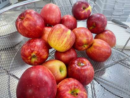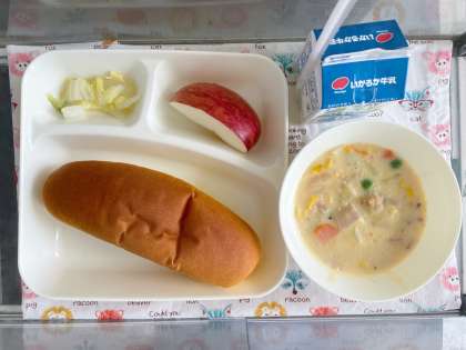 【パンプキンパン、牛乳、コーンクリームシチュー[米粉]、はくさいのピクルス、りんご】