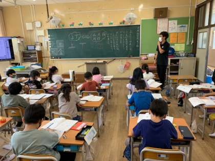 10月4日(月)1時間目、1年2組は国語で「上」や「下」の漢字に成り立ちについて学習していました。