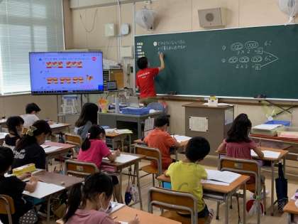 10月5日(火)1時間目、2年1組は算数で「どのようにならべるとかけ算を表せるか考えよう」というめあてで学習していました。