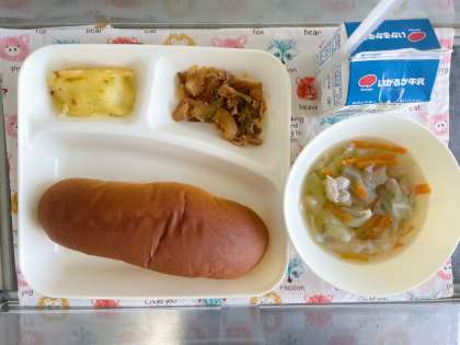 【黒糖パン、牛乳、豚肉と野菜のケチャップソテー、スープ、スイートポテト】