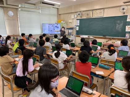10月11日(月)1時間目、4年1組は総合で防災について調べてきたことを新聞にまとめるようです。新聞へのまとめ方について、先生のお話を聞いていました。