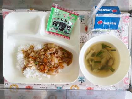 【牛乳、ピリ辛丼、中華スープ、ソフト黒豆】