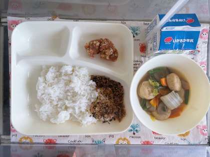 【ごはん、牛乳、鶏肉のたつたあげ、一口がんもと野菜の煮もの、おかかなっ葉】