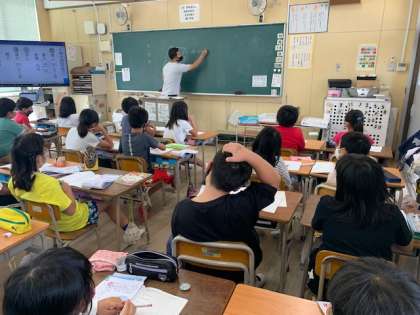 10月14日(木)1時間目、3年2組は算数で「ボールの形」の学習で計算ドリルの問題を考えていました。