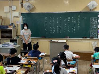 10月15日(金)1時間目、1年1組は国語でカタカナを学習していました。先生が「むずかしいのを書くよ」とおっしゃって黒板に書かれたのが「けちゃっぷ」でした。子どもたちは「できる。できる。」と言っていましたが、はたしてうまく書けたのでしょうか?
