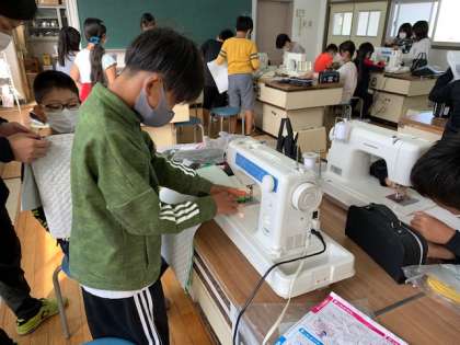 10月18日(月)1時間目、5年2組は家庭科でナップザック作りをしていました。今日はミシンを使って縫うところです。ミシンの使い方は以前に教えてもらったとのことでした。