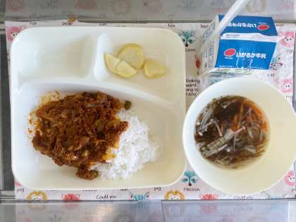 【牛乳、タコライス、もずくのスープ、焼きじゃが】