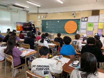 10月19日(火)2時間目、6年2組は理科で「月と太陽」の学習をしていました。黒板には太陽と地球の大きさが貼られていました。その大きさの違いに驚きました。太陽の表面の様子についてモニターを見ながら学習していました。
