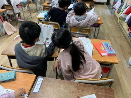 10月25日(月)1時間目、1年1組は国語で「ともだちと はなす」を学習していました。隣の人とお話をして話をつなぐ練習をしていました。