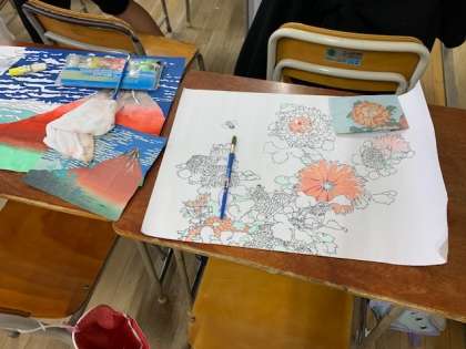10月25日(月)3時間目、6年2組は図工で浮世絵の模写をしていました。水を替えたり、パレットをしょっちゅう洗ったりして、細心の注意を払っているように思いました。