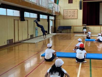 10月26日(火)1時間目、4年2組は体育でマット運動をしていました。倒立の練習をするために、倒立につながる動きの練習をするところでした。