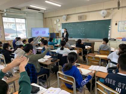 10月26日(火)4時間目、5年1組は算数で体積について学習していました。「1.4リットルを手で表してごらん。」と先生がおっしゃった時、多くの人がかなり大きい箱を表現していました。すると先生が「牛乳パックで1リットルですよ。」と言うと、小さな箱の形に修正している子が多くいました。