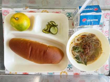 【黒糖パン、牛乳、タンタンめん、きゅうりの甘酢づけ、みかん】