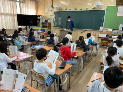 11月1日(月)1時間目、1年2組は国語で「はっけんしたよ」を音読していました。