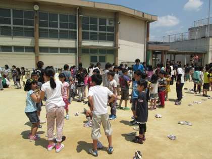今回は、教室で自己紹介・班編成などをしたあと、全員が運動場に集まって、ボール送りのゲームをしました。
