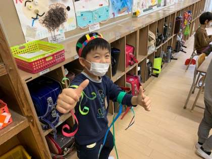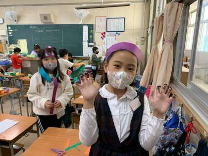 11月1日(月)4時間目、2年1組は図工で「わっかで へんしん」をつくっていました。なかなか楽しいものができていて、見せてくれました。
