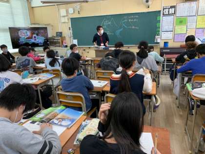 11月2日(火)5時間目、6年2組は理科で「大地のつくりと変化」を学習していました。黒板には浸食、運搬、堆積と書かれていましたので、川の水の働きを復習していたようです。