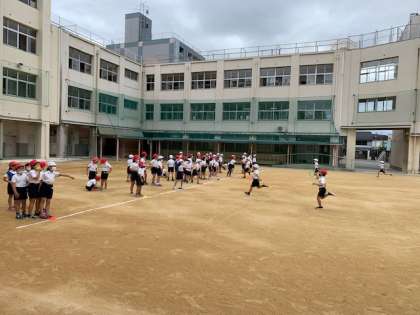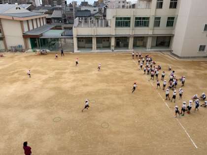 11月8日(月)1時間目、2年生は体育でリレーをしていました。折り返しリレーをしたあと、そのコースにフラフープを置いてジグザグに走っていくリレーをしていました。フラフープの置き方によって、勝敗が変わったのではないでしょうか。どのような置き方が速く走れたのでしょうか。