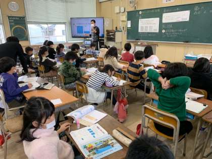 11月10日(水)1時間目、3年2組は算数で「あまりの大きさの表し方を考えよう」というめあてで学習していました。小数を使って「あまり」の部分を表すようです。