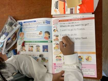 11月15日(月)1時間目、5年1組は外国語科で「I want to go to 〇〇.」を学習していました。話すだけでなく、英語で書く練習もしていました。