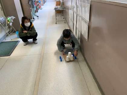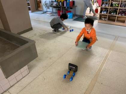 11月17日(水)1時間目、2年1組は生活科で風を受けて走る車をつくっていました。作れた子は廊下に出て下敷き等であおいで走らせていました。風を受ける部分を調整している子がいました。