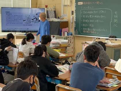 11月19日(金)2時間目、6年1組は社会科で明治時代について調べていました。「学制」「〒」「電信」「新聞」「鉄道」「学問のすすめ」等の言葉が黒板に書かれていました。