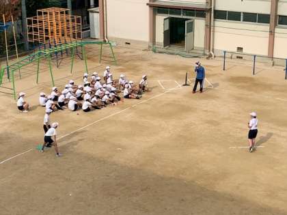 11月19日(金)4時間目、6年1組は体育でTボールをしていました。Tバッティングから野球型のゲームをします。先生からルールを聞いていました。最近は野球のルールを知らない子どもが多いそうです。