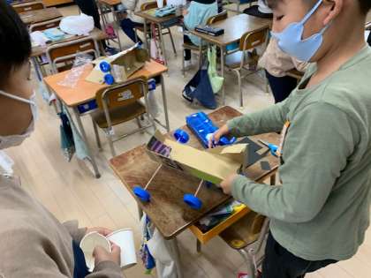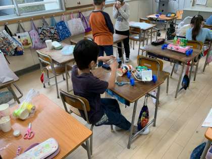 11月22日(月)2時間目、2年2組はおもちゃのお店を決めて、おもちゃの改良をしているようでした。