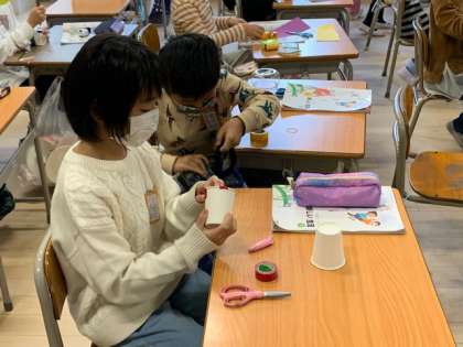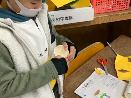 11月24日(水)1時間目、2年1組は生活科でおもちゃづくりをしていました。紙コップや輪ゴム、乾電池などを使って自分の作りたいものに挑戦していました。