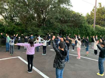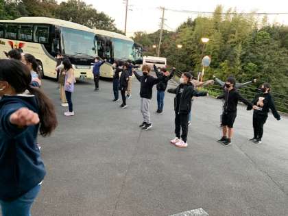 朝の集い 旅館の玄関にある書「一期一会」についてお話しをしました。みんな元気に朝を迎えました。