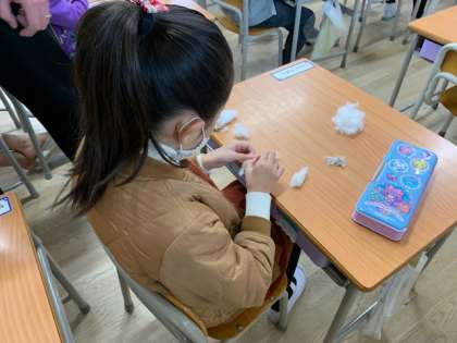12月1日(水)1時間目、1年2組は生活科で綿の観察をしながら、種を探し出していました。